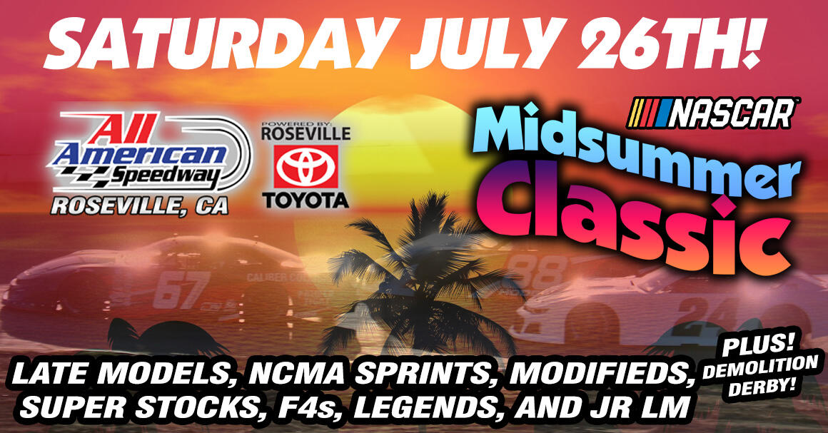 All-American Speedway 700 Event Center Drive, Roseville, CA, United StatesJoin us @the Grounds for the NASCAR MIDSUMMER CLASSIC on July 26! NASCAR Limited Pro Late Models, NCMA Sprint Cars, Modifieds, Super Stocks, F4s, NorCal Legends Series, Jr. Late Models. Check out hotel options here.