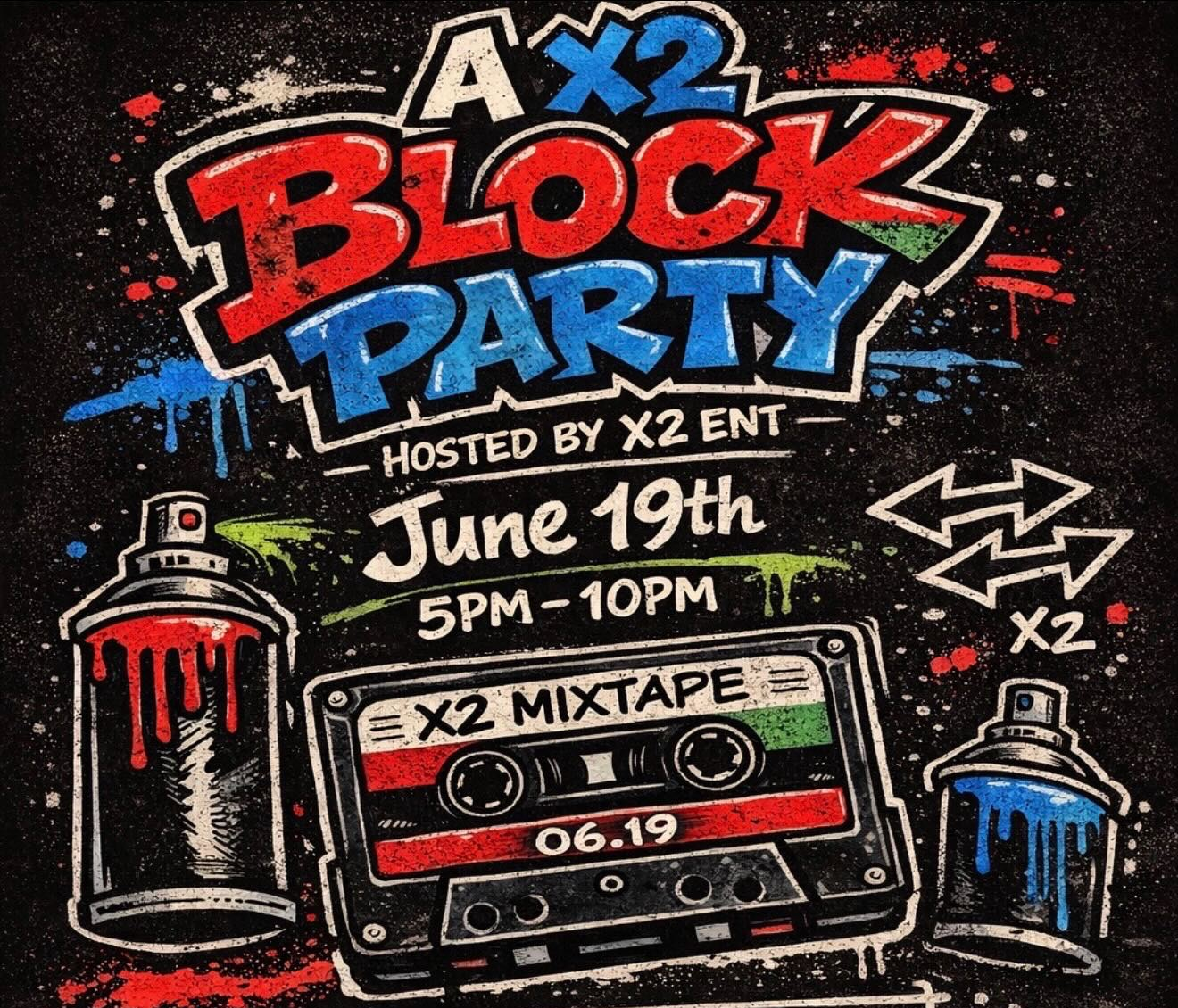 Friday, June 19th, 2026 get ready to dance at the X2 ENT Block Party from 5 PM - 10 PM! This outdoor event will be filled with live performances with food & drinks for sale. More info to come!